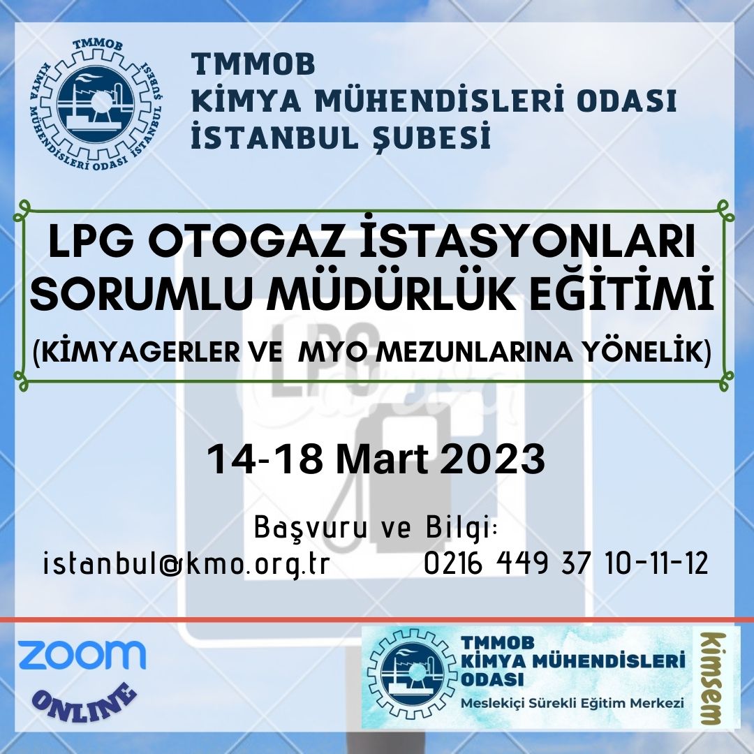 Odamız tarafından 14-15-16-17-18 Mart 2023 tarihlerinde LPG Otogaz İstasyonu Sorumlu Müdürlük Eğitimi (Kimyagerlere ve MYO Mezunlarına Yönelik) zoom programı üzerinden online olarak düzenlenecektir. Eğitim ile ilgili detayı ve eğitim başvuru formunu aşağıda bulabilirsiniz. Eğitime katılmak isteyenlerin, ekte bulunan başvuru formunu doldurarak istanbul@kmo.org.tr adresine göndermeleri gerekmektedir.