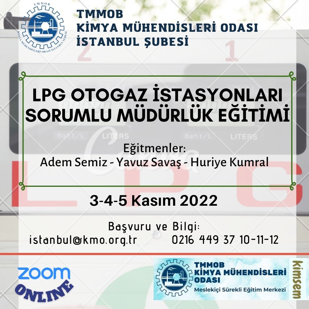 3-4-5 Kasım 2022 tarihlerinde LPG Otogaz İstasyonu Sorumlu Müdürlük Eğitimi (Mühendislere Yönelik) zoom programı üzerinden online olarak düzenlenecektir. Eğitim ile ilgili detayı ve eğitim başvuru formunu aşağıda bulabilirsiniz. Eğitime katılmak isteyenlerin, ekte bulunan başvuru formunu doldurarak istanbul@kmo.org.tr adresine göndermeleri gerekmektedir.