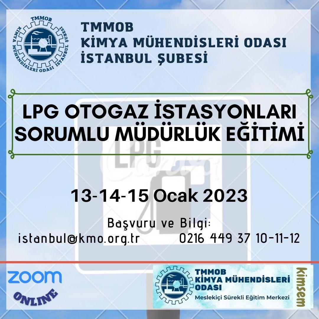 13-14-15 Ocak 2023 tarihlerinde LPG Otogaz İstasyonu Sorumlu Müdürlük Eğitimi (Mühendislere Yönelik) zoom programı üzerinden online olarak düzenlenecektir. Eğitim ile ilgili detayı ve eğitim başvuru formunu aşağıda bulabilirsiniz. Eğitime katılmak isteyenlerin, ekte bulunan başvuru formunu doldurarak istanbul@kmo.org.tr adresine göndermeleri gerekmektedir.