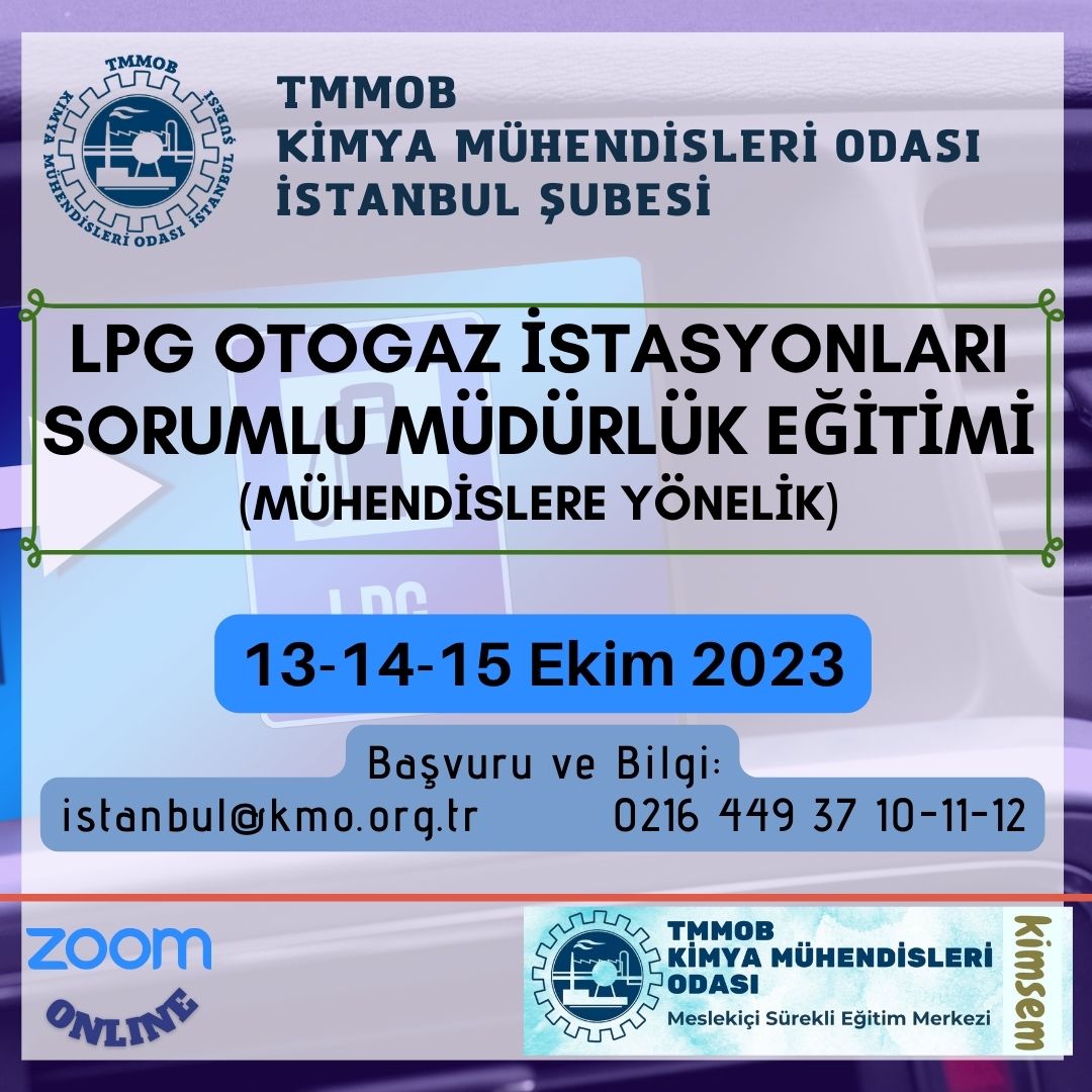Odamız tarafından 13-14-15 Ekim 2023 tarihlerinde LPG Otogaz İstasyonu Sorumlu Müdürlük Eğitimi (Mühendislere Yönelik) zoom programı üzerinden online olarak düzenlenecektir. Eğitim ile ilgili detayı ve eğitim başvuru formunu aşağıda bulabilirsiniz. Eğitime katılmak isteyenlerin, ekte bulunan başvuru formunu doldurarak istanbul@kmo.org.tr adresine göndermeleri gerekmektedir.