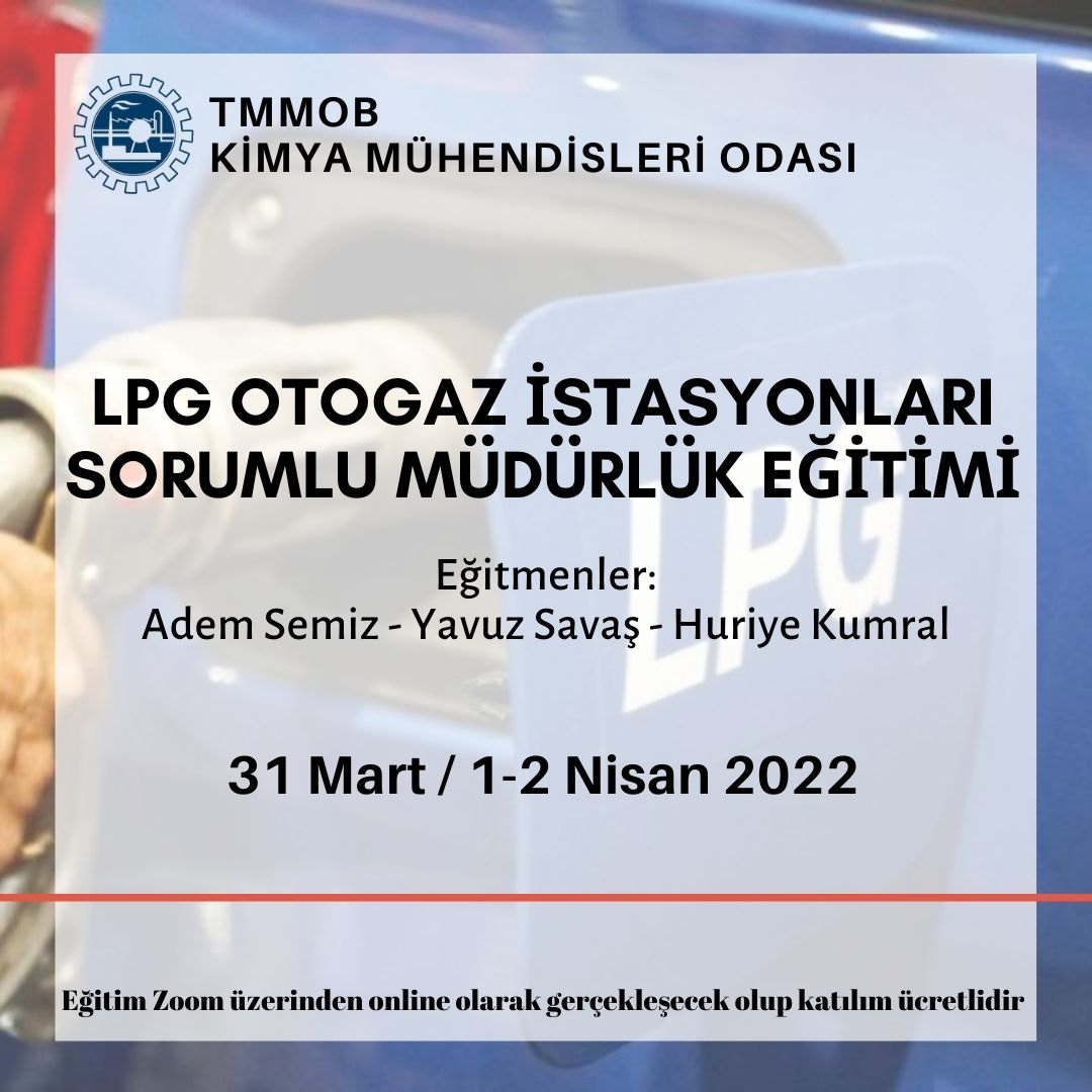 31 Mart / 1-2 Nisan 2022 tarihlerinde LPG Otogaz İstasyonu Sorumlu Müdürlük Eğitimi (Mühendislere Yönelik) zoom programı üzerinden online olarak düzenlenecektir. Eğitim ile ilgili detaylı bilgiyi ve eğitim başvuru formunu aşağıda bulabilirsiniz.