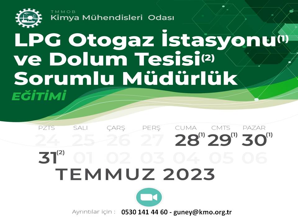 LPG otogaz istasyonlarında ve dolum tesislerinde sorumlu müdür olarak görev almak isteyen, SIVILAŞTIRILMIŞ PETROL GAZLARI (LPG) PİYASASI EĞİTİM VE SORUMLU MÜDÜR YÖNETMELİĞİnde sorumlu müdür olacak kişilerde aranan şartları sağlayan kişilere yönelik eğitimimiz, otogaz istasyonlarında sorumlu müdürlük için 28-29-30 Temmuz 2023, dolum tesislerinde sorumlu müdürlük için 31 Temmuz 2023 tarihlerinde düzenlenecektir.