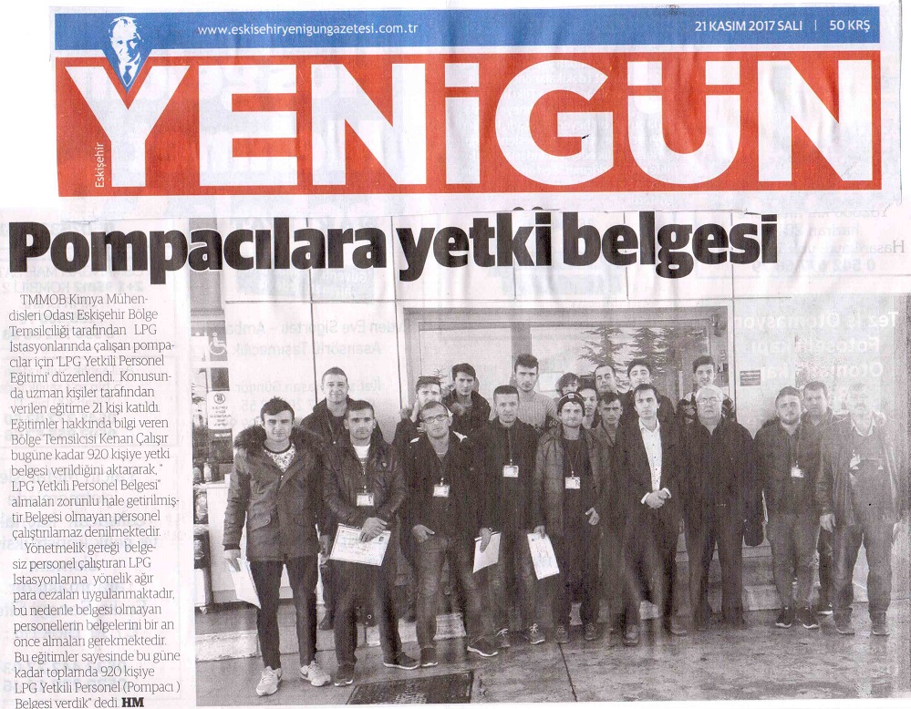 TMMOB Kimya Mühendisleri Odası Eskişehir Bölge Temsilciliği tarafından 16-17 Kasım 2017 tarihlerinde LPG İstasyonlarında çalışan Pompacılar için LPG Yetkili Personel Eğitiminin 53. düzenlendi. Eğitimler Konusunda Uzman Kimya Mühendisleri tarafından verildi. Eğitime toplam 21 kişi katıldı. Bu eğitimler sayesinde bu güne kadar toplamda 920 kişiye LPG YETKİLİ PERSONEL (POMPACI) BELGESİ verilmiştir. Eğitim sonrasında Ankara Yolunda ki Karacan Petrol Tesislerine gidilip öğrenilen konular hakkında bir tatbikat gerçekleştirildi. Eğitimi başarı ile tamamlayan katılımcılara düzenlenen törenle TMMOB Kimya Mühendisleri Odası tarafından LPG Yetkili Personel Belgeleri verildi.