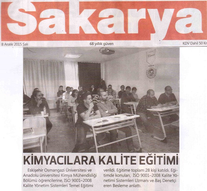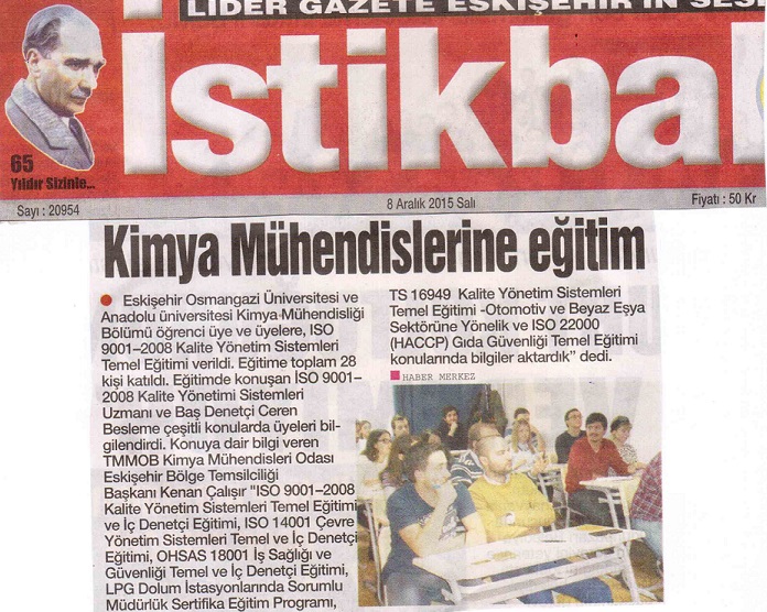 5-6 Aralık 2015 tarihlerinde Eskişehir Osmangazi Üniversitesi ve Anadolu üniversitesi Kimya Mühendisliği Bölümü öğrenci üyelerimize ve üyelerimize, ISO 9001-2008 Kalite Yönetim Sistemleri Temel Eğitimi verilmiştir. Eğitime toplam 28 kişi katılmış; İSO 9001-2008 Kalite Yönetimi Sistemleri Uzmanı ve Baş Denetçi Ceren BESLEME nin anlattığı eğitimimiz Eskişehir yerel basınında yerini aldı.