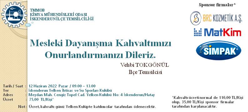 İskenderun İlçe Temsilciliğimiz tarafından 12 Haziran 2022 Pazar günü İskenderun Yelken Kulübünde düzenlenecek olan "Mesleki Dayanışma Kahvaltısı" na üyelerimizin aileleriyle birlik katılmaları bizleri onurlandıracaktır.