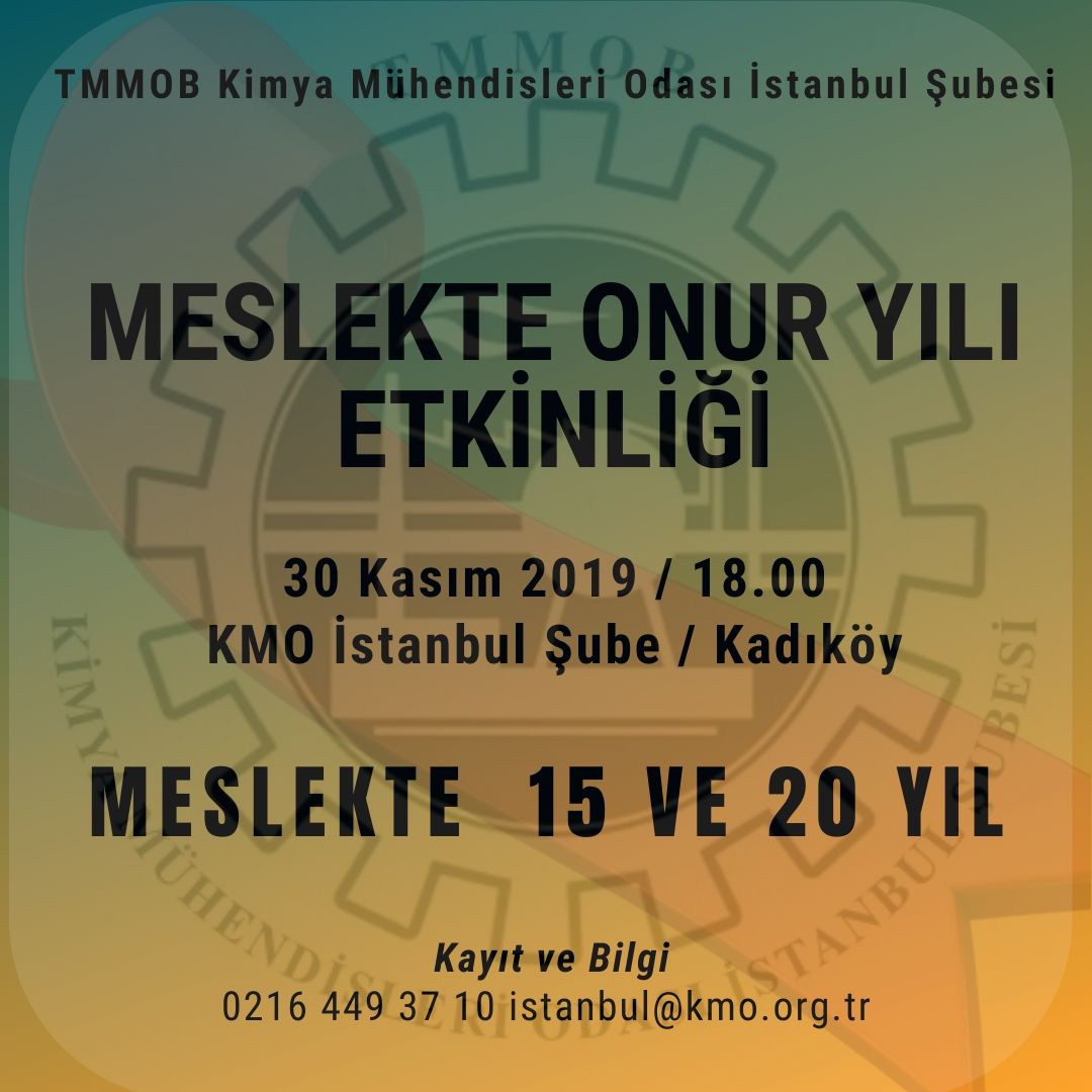 TMMOB Kimya Mühendisleri Odası İstanbul Şubesi olarak üyelerimize mezun olduğu zamandan bu yana onurlu bir meslek olan mühendisliği icra ettikleri için Meslekte Onur Yılı Etkinliği gerçekleştireceğiz.