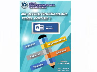 10 Ocak 2021 tarihinde MS OFFICE PROGRAMLARI TEMEL EĞİTİMİ-1 online düzenlenecektir. Eğitim ile ilgili detaylı bilgi aşağıdadır. Eğitime katılmak isteyen üyelerimizin, başvuru formunu doldurarak 08 Ocak 2021 saat: 16.00 a kadar ege@kmo.org.tr adresine mail olarak göndermelerini rica ederiz.