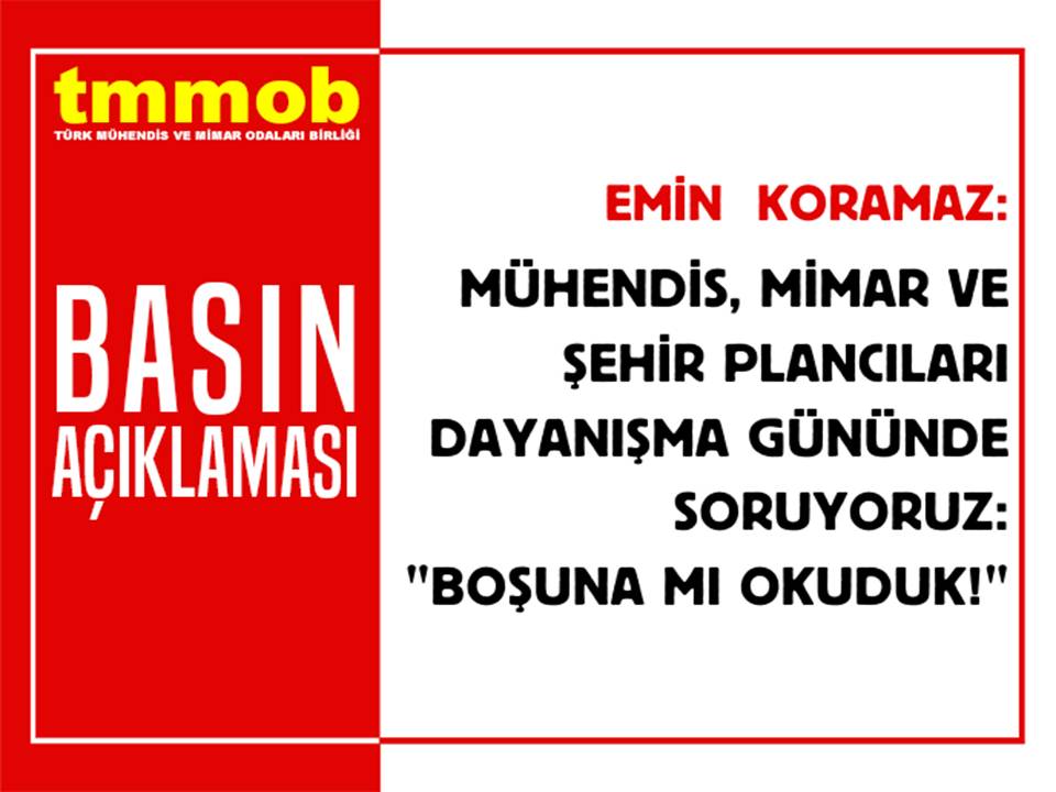 TMMOB Yönetim Kurulu Başkanı Emin Koramaz, 19 Eylül 1979 İş Bırakma Eylemi`nin 44. yıldönümü olan `Mühendis, Mimar ve Şehir Plancıları Dayanışma Günü`nde bir basın açıklaması yaparak TMMOB`nin başlattığı `Boşuna mı Okuduk` kampanyasını vurguladı.