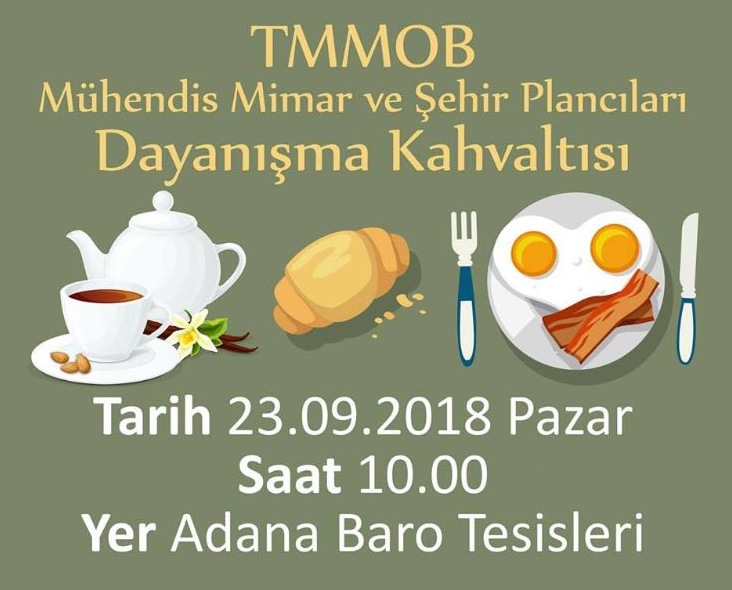 TMMOB Adana İl Koordinasyon Kurulu tarafından Mühendis, Mimar ve Şehir Plancıları Dayanışma Günü dolayısı ile 23 Eylül 2018 Pazar Günü Adana Baro Tesislerinde dayanışma kahvaltısı programlanmıştır.