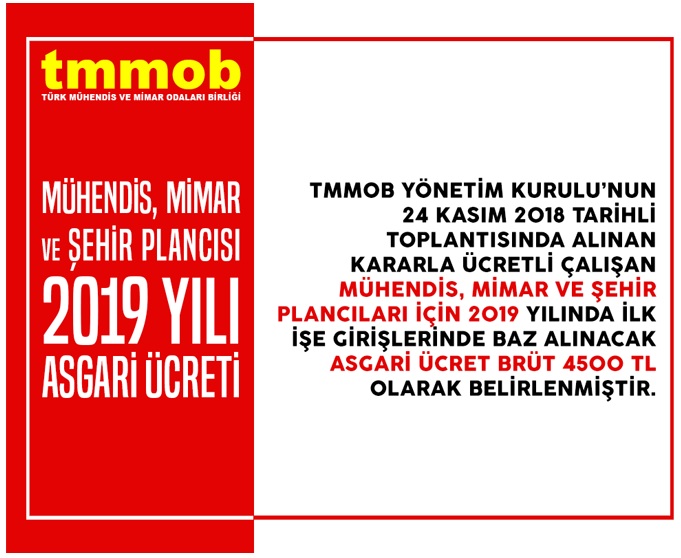 TMMOB Yönetim Kurulu tarafından alınan karar uyarınca ücretli çalışan Mühendis, Mimar ve Şehir Plancıları Asgari Ücreti 2019 yılı için brüt 4500 TL olarak tespit edildi.