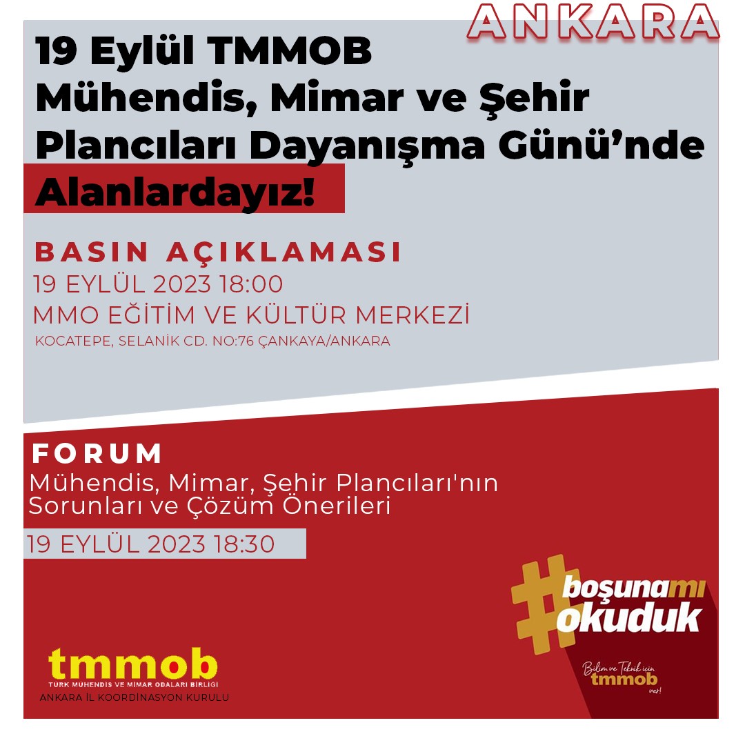 19 Eylül Salı günü saat:18:00`de MMO Eğitim Ve Kültür Merkezi`nde (Selanik Caddesi No:76 Kızılay/ Çankaya / Ankara) kitlesel basın açıklaması yapılacak ve ardından saat:18:30`da Mühendis, Mimar ve Şehir Plancıları`nın Sorunları ve Çözüm Önerileri konulu forum gerçekleştirilecektir.