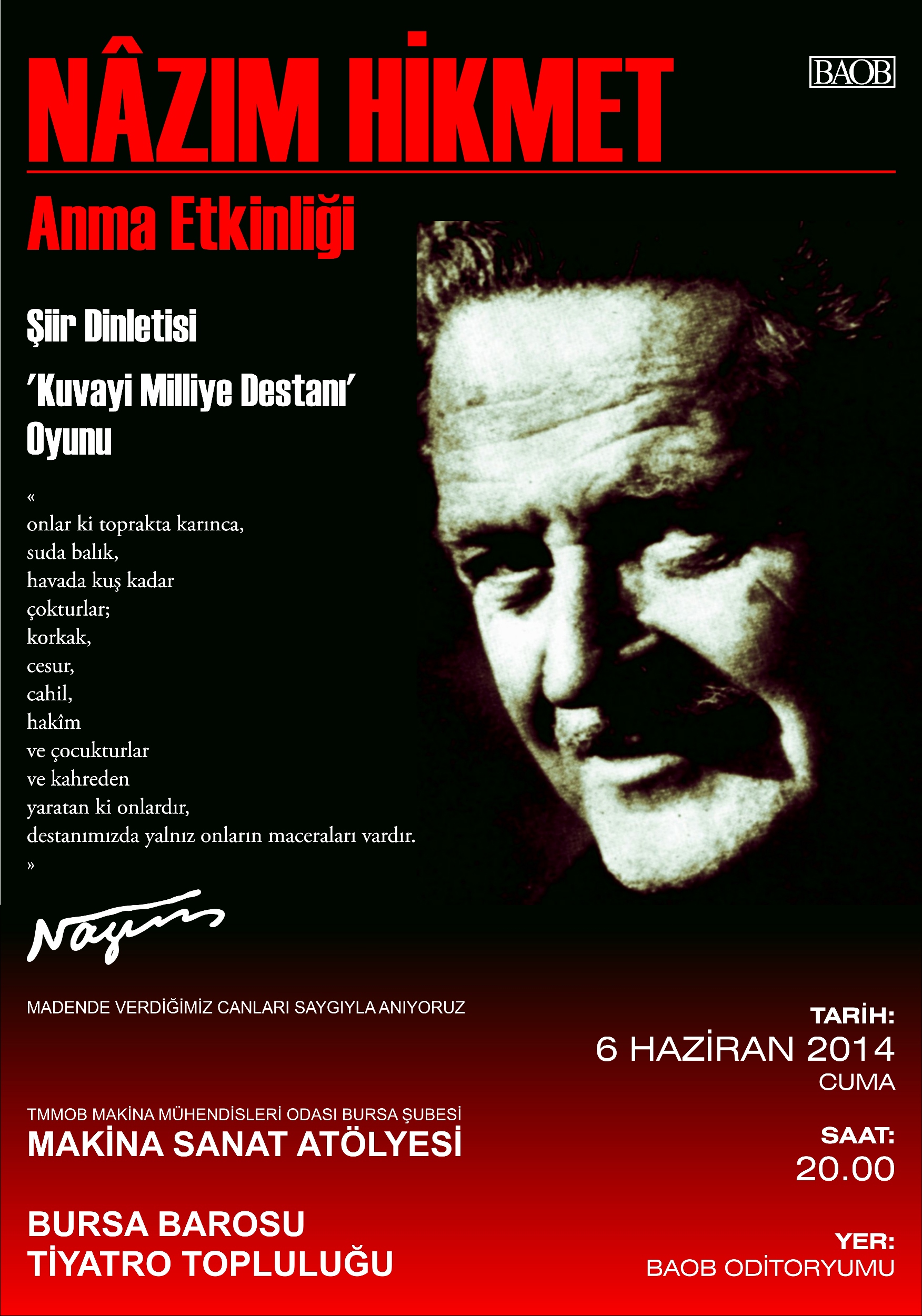 BAOB Bileşeni odalarımızla ortaklaştırdığımız, Nazım Hikmet`i anma etkinliği kapsamında 06 Haziran 2014 saat: 20.00da BAOB Oditoryum salonunda bir dizi etkinlik düzenlenecektir. Etkinliğe katılımınızı rica ederiz.