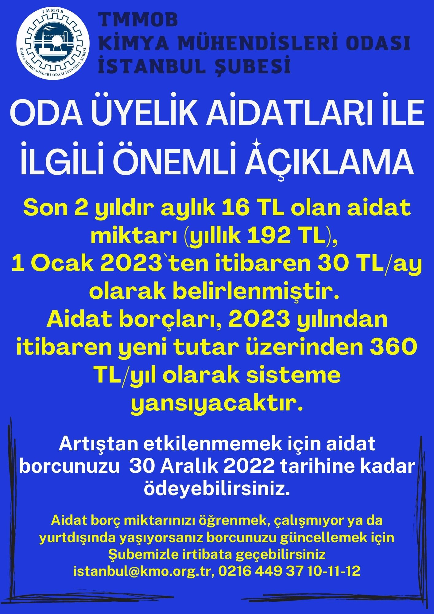 Son 2 yıldır aylık 16 TL olan aidat miktarı (yıllık 192 TL), Oda 48. Dönem Olağan Genel Kurulu kararı ile 1 Ocak 2023`ten itibaren 30 TL/ay olarak belirlenmiştir. Yönetmelik gereği geçmiş yıllar dahil aidat borçları, 2023 yılından itibaren yeni tutar üzerinden 360 TL/yıl olarak sisteme yansıyacaktır.