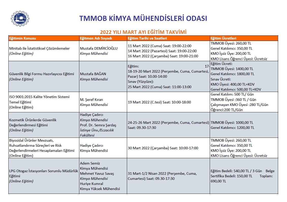 Odamız tarafından planlanan 2022 yılı Mart ayı Eğitim Takvimimiz yayınlandı. Eğitimlere başvurmak için aşağıda dosyalar kısmında yer alan uygun başvuru formunu doldurup istanbul@kmo.org.tr adresine göndermenizi rica ederiz. Her bir eğitime ilişkin eğitim içerikleri ayrı ayrı olarak ilerleyen zamanlarda ayrıca yayınlanacaktır.