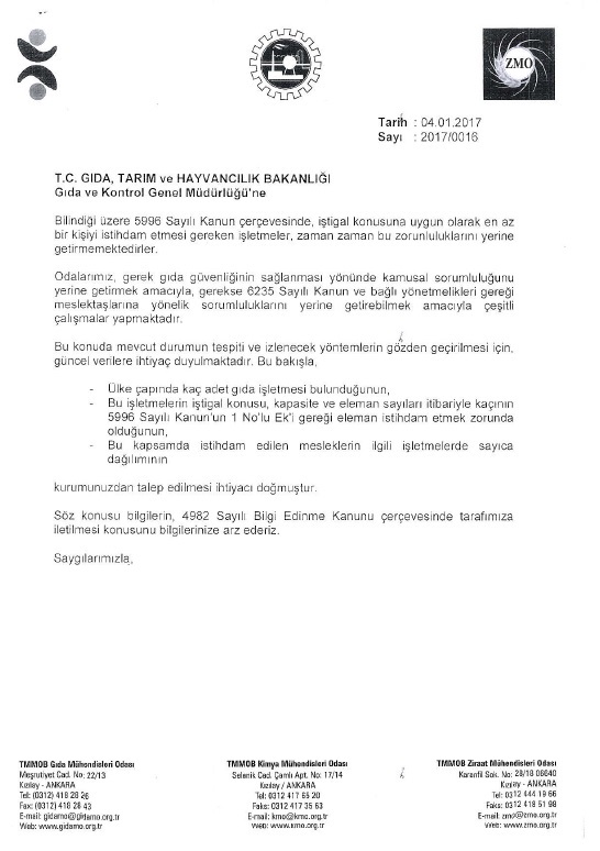 Gıda ve Kontrol Genel Müdürlüğüne hitaben yazılan yazıda 5996 Sayılı Kanun çerçevesinde, iştigal konusuna uygun olarak en az bir kişiyi istihdam etmesi gereken işletmelerin zaman zaman bu zorunluluklarını yerine getirmediği belirtilerek Odalarımızın gerek gıda güvenliğinin sağlanması yönünde kamusal sorumluluğunu ve gerekse de 6235 Sayılı Kanun ve bağlı yönetmelikleri gereği meslektaşlarına yönelik sorumluluklarını yerine getirebilmek amacıyla çeşitli çalışmalar yaptığı belirtilerek bu konuda mevcut durumun tespiti ve izlenecek yöntemlerin elden geçirilmesi için güncel verilere ihtiyaç duyulduğu ifade edilmiştir. Bunu takiben Bakanlıktan;