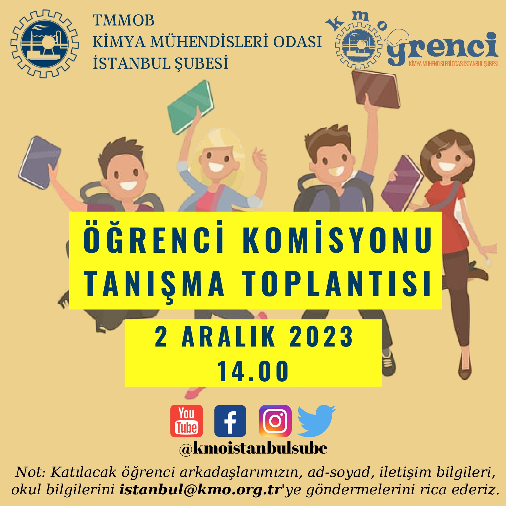 İstanbul'daki üniversitelerin Kimya Mühendisliği, Biyomühendislik, Polimer Mühendisliği ve Biyoproses Mühendisliği lisans bölümlerinde okuyan öğrenci arkadaşlarımızla dönem çalışmalarını başlatıyoruz. Her dönem başında aramıza yeni katılan öğrencilerimizle geleneksel olarak düzenlediğimiz "Öğrenci Tanışma Toplantısı" bu yıl 2 Aralık Cumartesi günü saat 14.00'te Şubemizde gerçekleştirilecektir.