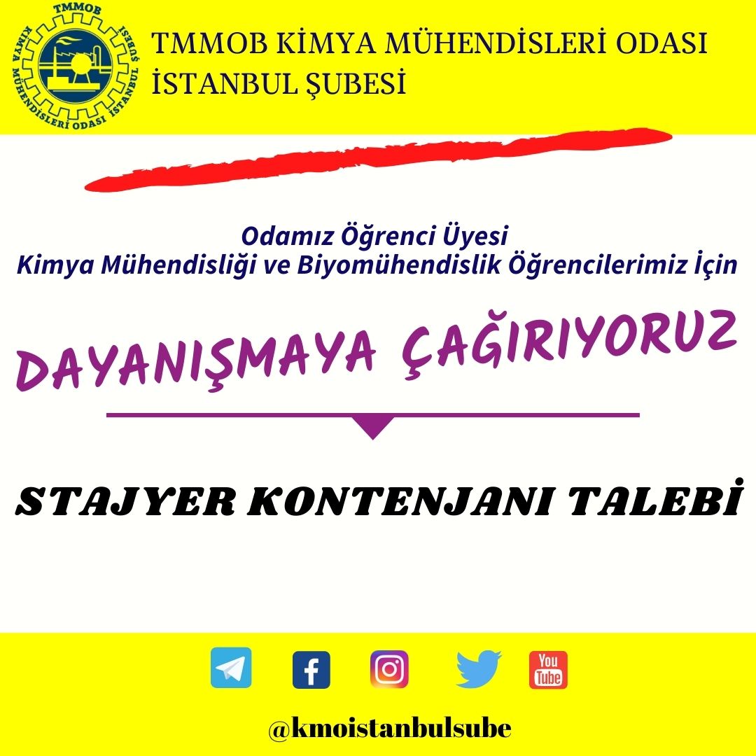 Bu bağlamda, Kimya Mühendislerini ve Biyomühendisleri temsil eden TMMOB Kimya Mühendisleri Odası İstanbul Şubesi Yönetim Kurulu olarak, öğrencilerimizin staj ihtiyaçlarını karşılamak için Kimya sektöründe yer alan/çalışan kuruluş, kurum ve meslektaşlarımıza çağrıda bulunarak organizasyon oluşturmuştur.