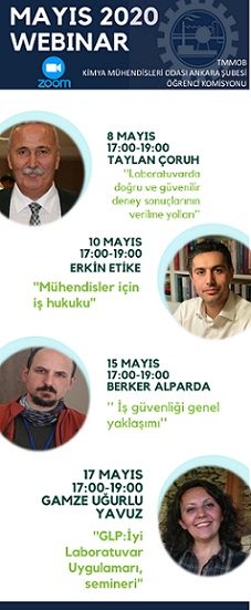 Koronavirüs pandemisi sebebiyle evde kaldığımız bu günleri iyi değerlendirmek için, TMMOB Kimya Mühendisleri Odası Ankara Şubesi`nin online platformda düzenlediği Mayıs ayı seminerleri başvuruları başladı!