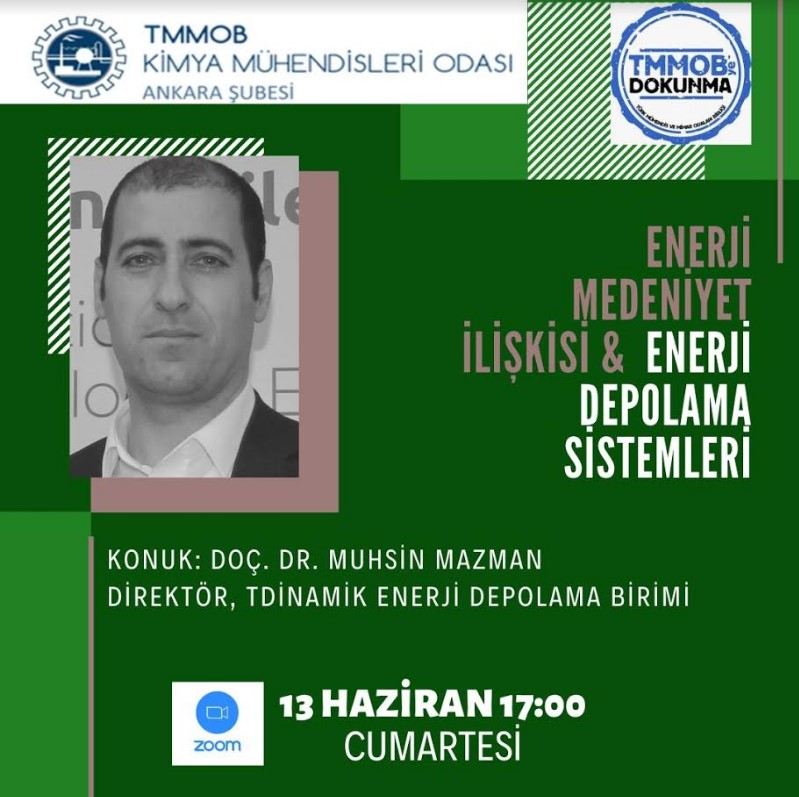 13 Haziran 2020 tarihinde saat:17:00`de Doç. Dr. Muhsin MAZMAN`ın sunumuyla Zoom üzerinden ENERJİ MEDENİYET İLİŞKİSİ & ENERJİ DEPOLAMA SİSTEMLERİ online semineri gerçekleştirilecek olup, katılım ücretsizdir. Kayıt için lütfen tıklayınız.
