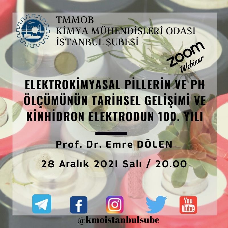 Şubemiz tarafından 28 Aralık 2021 Salı günü, saat 20.00`da Odamız üyelerinden Prof. Dr. Emre Dölen ile "Elektrokimyasal Pillerin ve pH Ölçümünün Tarihsel Gelişimi ve Kinhidron Elektrodun 100. Yılı" konulu online söyleşimiz gerçekleşecektir. Söyleşimiz zoom üzerinden gerçekleşecek olup, zoom katılım linki başvuru yapan kişilere, söyleşinin olduğu gün mesai bitimine kadar gönderilecektir.