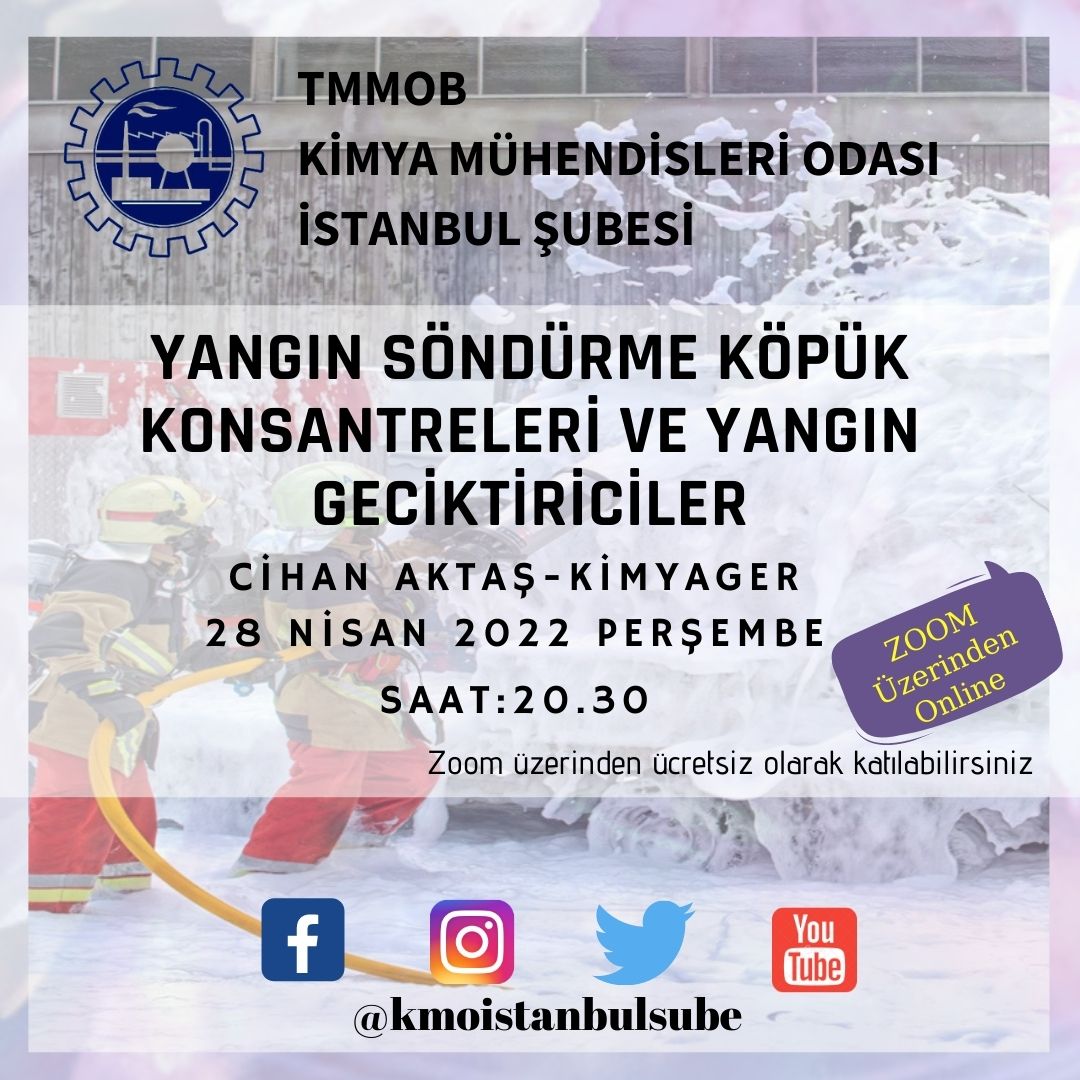26 Nisan Perşembe akşamı saat 20.30`da Cihan Aktaş ile Yangın Söndürme Köpük Konsantreleri Ve Yangın Geciktiriciler söyleşimiz zoom programı üzerinden online olarak gerçekleşecektir.