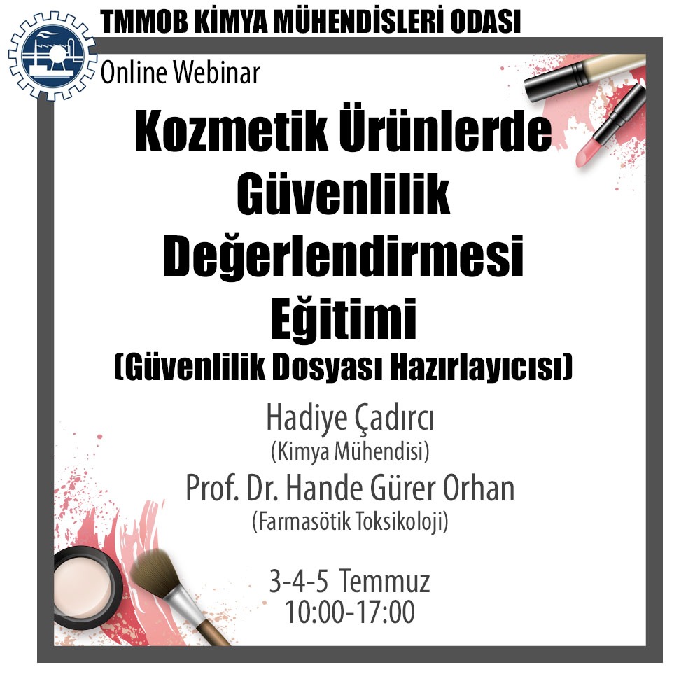 3-4-5 Temmuz 2020 tarihinde KOZMETİK ÜRÜNLERDE GÜVENLİLİK DEĞERLENDİRMESİ (Güvenlilik Dosyası Hazırlayıcısı Eğitimi) online webinar eğitimi düzenlenecektir. Eğitim ile ilgili detaylı bilgi aşağıda yer almakta olup eğitim başvuru formunu ekte dosyalar kısmında bulabilirsiniz.