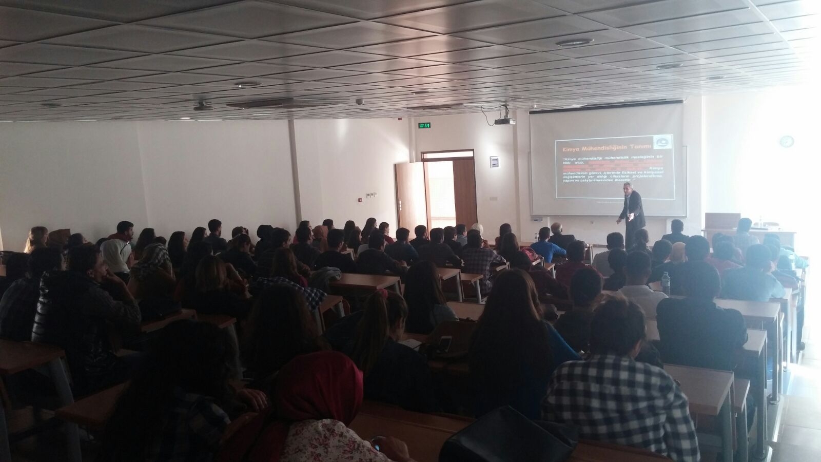 Kimya Mühendisliğinde okuyan öğrencilere Kimya Mühendisliği mesleğinin ve Kimya Mühendisleri Odası`nın tanıtımı, Şube Müdürümüz Yusuf Sakar tarafından yapıldı. Konferansa Kimya Mühendisliği Bölüm Başkanı Yrd.Doç. Dr. Hacer İçen, Öğretim Görevlisi Yrd. Doç. Dr. Eda Akgül, Arş. Gör. Havva Mumcu Şimşek ve tüm Kimya Mühendisliği öğrencileri dinleyici olarak katıldı.