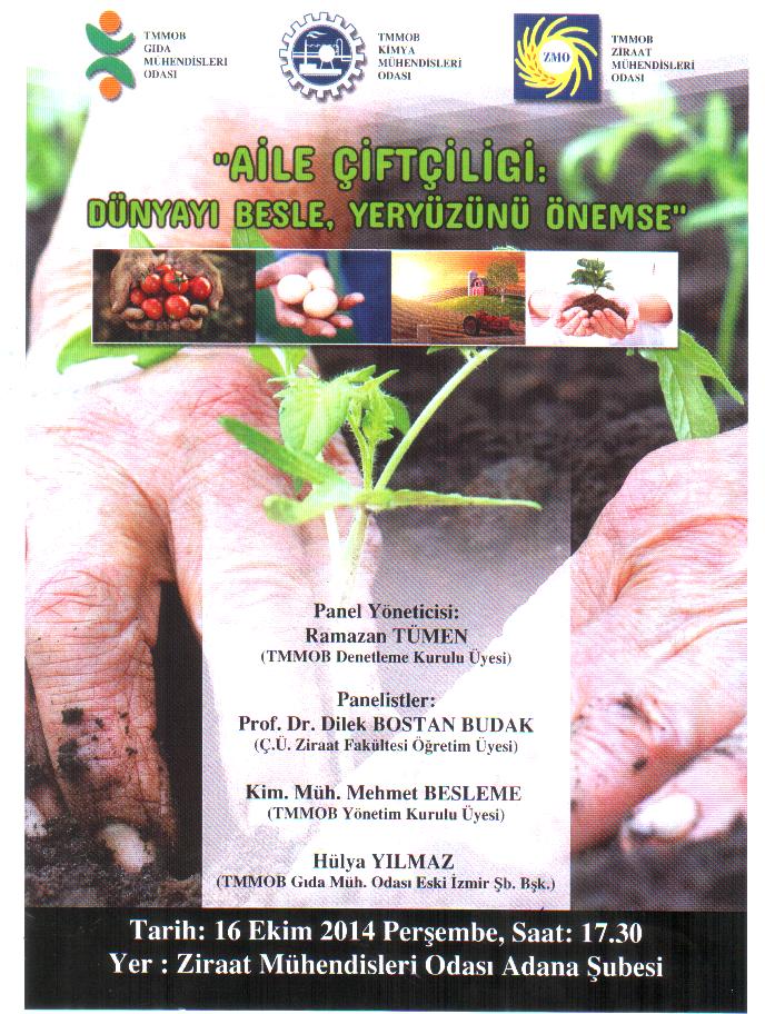 16 Ekim 2014 Dünya Gıda Günü nedeniyle, TMMOB Gıda Mühendisleri Odası Adana Şubesi, TMMOB Kimya Mühendisleri Odası Güney Bölge Şubesi ve TMMOB Ziraat Mühendisleri Odası Adana Şubesi`nin ortaklaşa düzenleyeceği "Aile Çiftçiliği: Dünyayı Besle, Yeryüzünü Önemse" konulu panele 16 Ekim 2014 Perşembe saat 17.30`da TMMOB Ziraat Mühendisleri Odası Adana Şubesi Konferans Salonunda (KURTULUŞ MAH. 22 SOKAK SAYILIR APT. ZEMİN KAT SEYHAN - ADANA) düzenlenecektir. Katılımınızı bekler, saygılar sunarız.