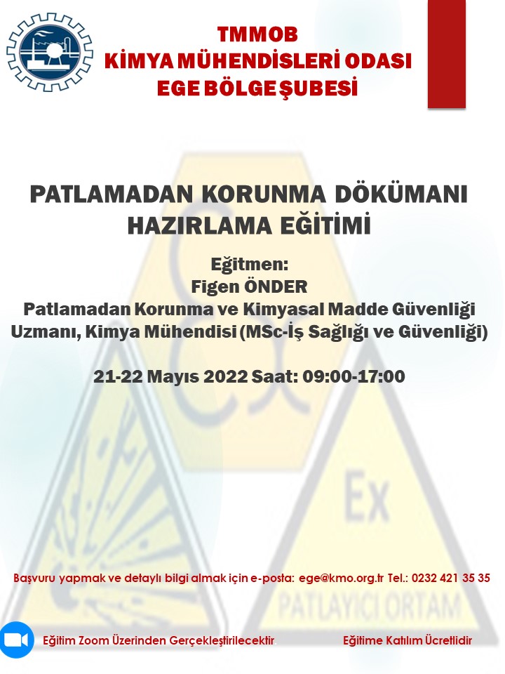 21-22 Mayıs 2022 tarihlerinde PATLAMADAN KORUNMA DOKÜMANI HAZIRLAMA EĞİTİMİ online olarak düzenlenecektir. Eğitim ile ilgili detaylı bilgi aşağıda yer almakta olup eğitim başvuru formunu ekte dosyalar kısmında bulabilirsiniz. Eğitime katılmak isteyen üyelerimizin, başvuru formunu doldurarak 18 Mayıs 2022 tarihine kadar ege@kmo.org.tr e-mail adresine göndermelerini rica ederiz.