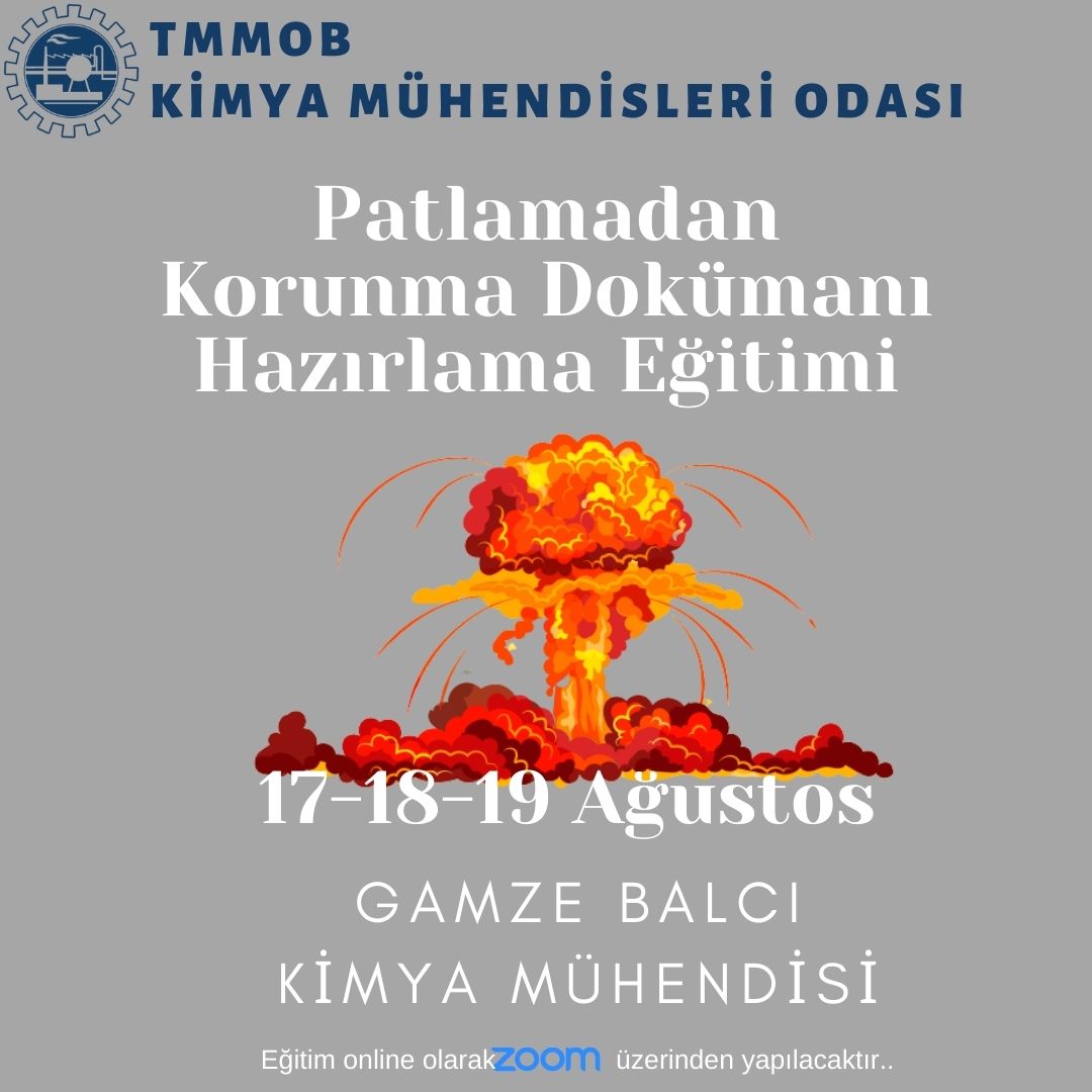 17-18-19 Ağustos 2021 tarihlerinde "PATLAMADAN KORUNMA DOKÜMANI HAZIRLAMA EĞİTİMİ" online olarak düzenlenecektir. Eğitim ile ilgili detaylı bilgi aşağıda yer almakta olup eğitim başvuru formunu ekte dosyalar kısmında bulabilirsiniz. Eğitime katılmak isteyenlerin, başvuru formunu doldurarak ege@kmo.org.tr adresine göndermelerini rica ederiz.