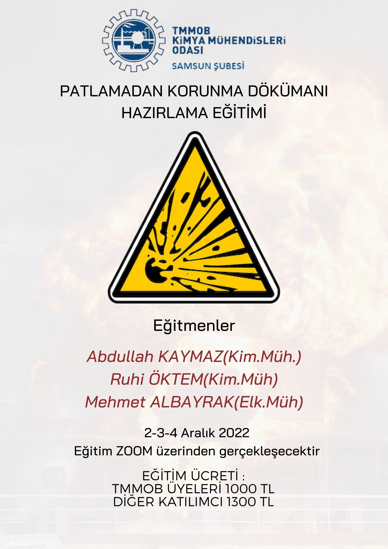 Samsun Şubemiz tarafından 2-3-4 Aralık tarihlerinde Patlamadan Korunma Dökümanı Hazırlama Eğitimi düzenlenecektir.