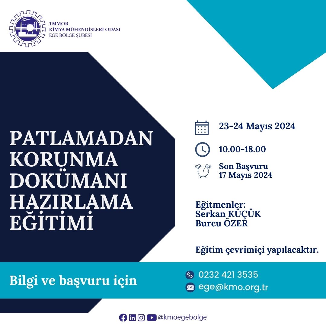 TMMOB Kimya Mühendisleri Odası tarafından 23-24 Mayıs 2024 tarihlerinde 10.00-18.00 saatleri arasında " Patlamadan Korunma Dokümanı Hazırlama Eğitimi " zoom programı üzerinden online olarak düzenlenecektir. Eğitim ile ilgili detaylı bilgi aşağıda yer almakta olup eğitime katılmak isteyenlerin, ekte gönderilen başvuru formunu doldurup istenen belgeler ile birlikte 17 Mayıs 2024 tarihine kadar ege@kmo.org.tr adresine göndermelerini rica ederiz.