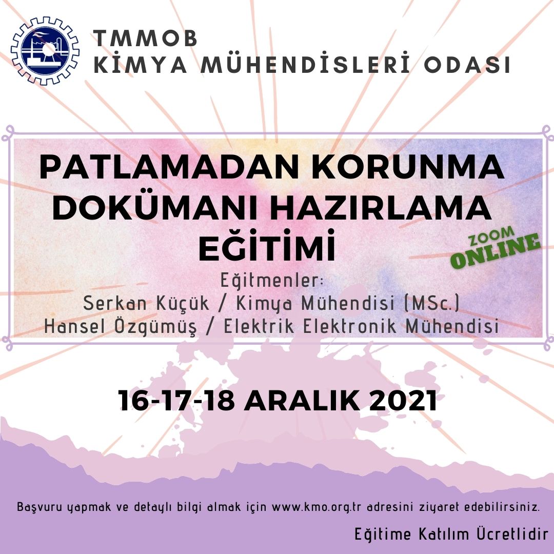 16-17-18 Aralık 2021 tarihlerinde "PATLAMADAN KORUNMA DOKÜMANI HAZIRLAMA EĞİTİMİ" online olarak düzenlenecektir. Eğitim ile ilgili detaylı bilgi ve başvuru formunu ekte dosyalar kısmında bulabilirsiniz. Eğitime katılmak isteyenlerin, başvuru formunu doldurarak guney@kmo.org.tr adresine göndermelerini rica ederiz.