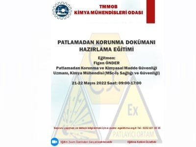 21-22 Mayıs 2022 tarihlerinde "PATLAMADAN KORUNMA DOKÜMANI HAZIRLAMA EĞİTİMİ" online olarak düzenlenecektir. Eğitim ile ilgili detaylı bilgi ve başvuru formunu ekte dosyalar kısmında bulabilirsiniz. Eğitime katılmak isteyenlerin, başvuru formunu doldurarak guney@kmo.org.tr adresine göndermelerini rica ederiz.