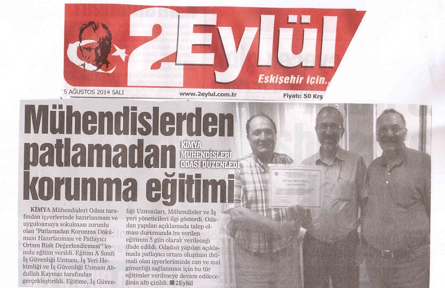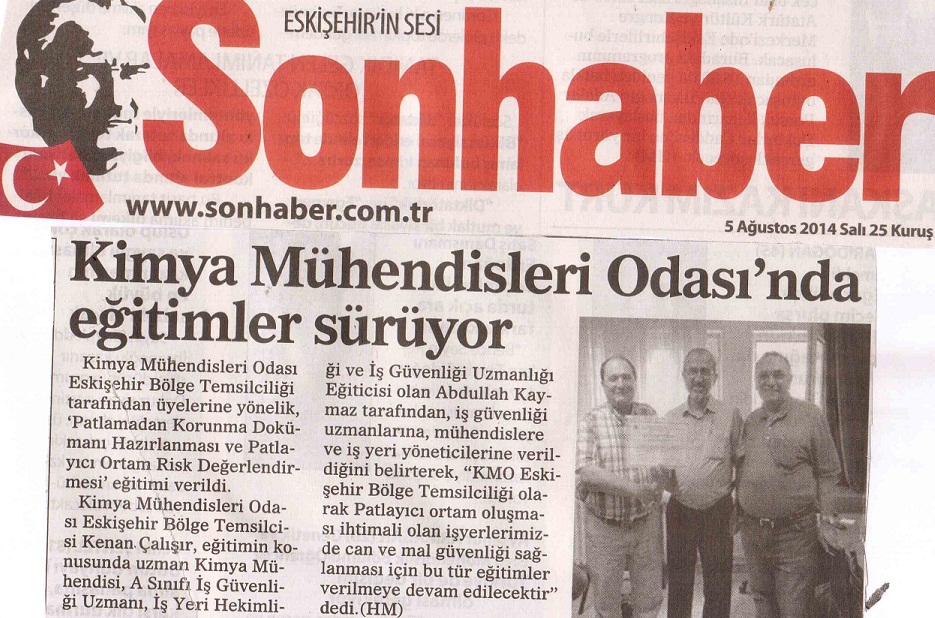 Patlayıcı Ortamların Tehlikelerinden Çalışanların Korunması Hakkında Yönetmelik 10. madde kapsamında işverenler tarafından patlamadan korunma dokümanı hazırlanması gerekmektedir.Bu nedenle; Konusunda uzman Kimya Mühendisi,A Sınıfı İş Güvenliği Uzmanı , İş Yeri Hekimliği ve İş Güvenliği Uzmanlığı Eğiticisi olan Abdullah KAYMAZ tarafından 1-2-3 Ağustos 2014 tarihlerinde odamızda verilen eğitim yerel basında yer almıştır.