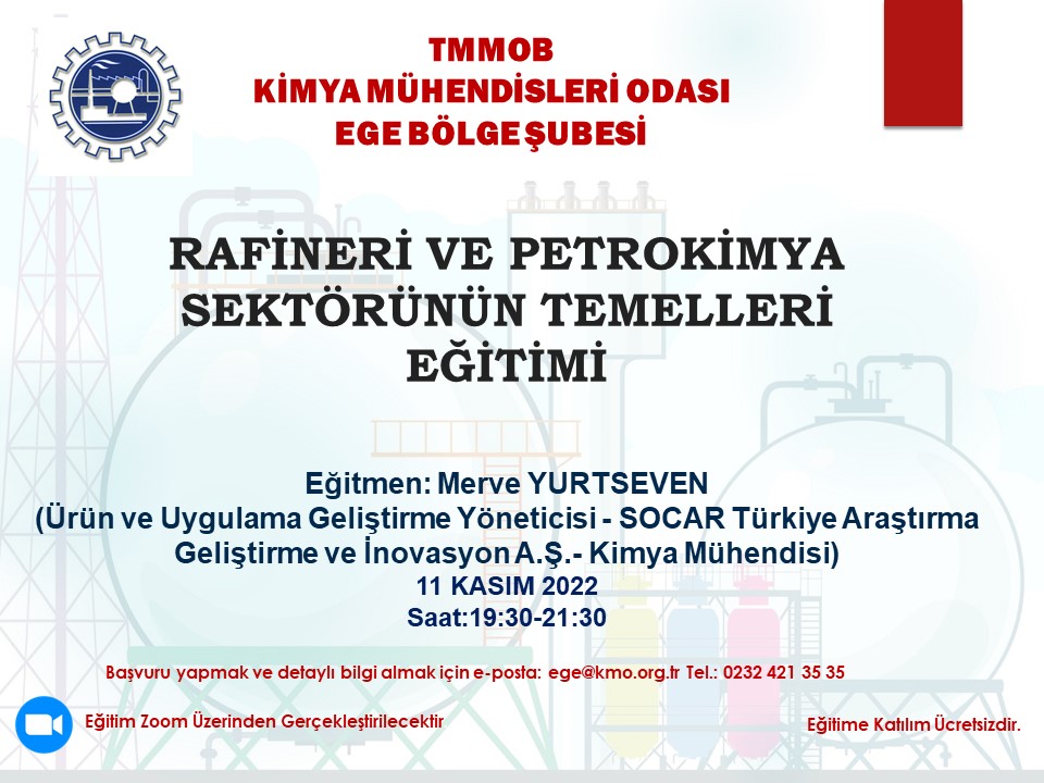 11 Kasım 2022 Cuma günü 19.30-21.30 saatleri arasında düzenleyeceğimiz "PETROKİMYANIN TEMELLERİ EĞİTİMİ" zoom programı üzerinden online olarak gerçekleşecektir. Eğitim ile ilgili detaylı bilgi aşağıda olup eğitime katılmak isteyenlerin, ekte gönderilen başvuru formunu doldurup istenen belgeler ile birlikte ege@kmo.org.tr adresine göndermelerini rica ederiz.