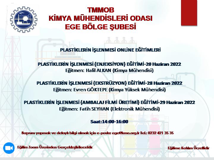 20, 28, 29 HAZİRAN 2022 tarihlerinde PLASTİKLERİN İŞLENMESİ ONLİNE EĞİTİMLERİ zoom programı üzerinden düzenlenecektir. Eğitimler ile ilgili detaylı bilgi aşağıda yer almakta olup eğitim başvuru formunu ekte bulabilirsiniz. Eğitime katılmak isteyenlerin, başvuru formunu doldurarak 15 Haziran 2022 tarihine kadar ege@kmo.org.tr e-posta adresine göndermelerini rica ederiz.