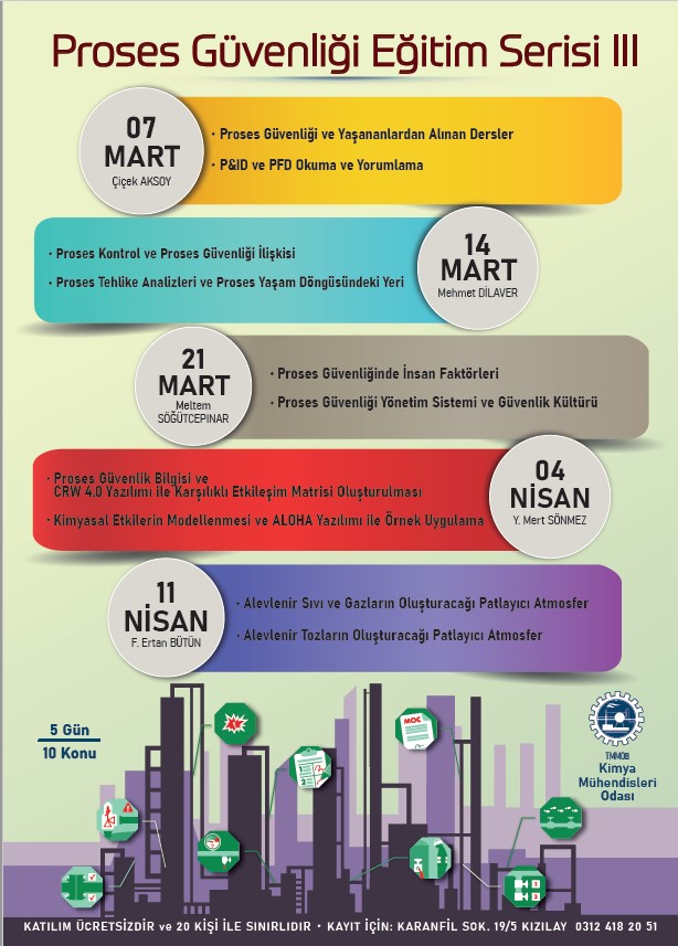 Öğrenci üyelerimiz ve yeni mezun işsiz üyelerimiz için ücretsiz olarak düzenlediğimiz 5 hafta sürecek olan Proses Güvenliği Eğitim Serisi`nin üçüncüsü 07 Mart 2020 tarihinde başlayacak olup detaylı program ektedir. 5 haftalık programın tamamına katılım sağlayanlara eğitim katılım sertifikası verilecektir. Etkinliğimiz 20 kişilik kontenjanla sınırlıdır. İlk başvuran 20 kişi kayıt yaptırabilecektir.