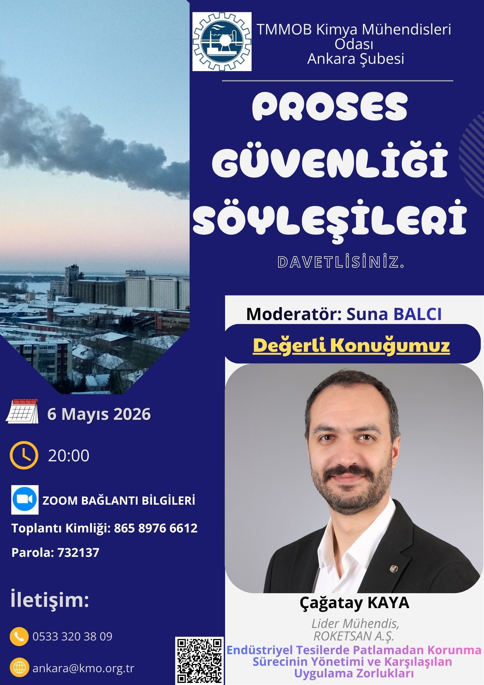 TMMOB KMO Ankara Şubesi tarafından düzenlenen Proses Güvenliği Söyleşileri, 6 Mayıs 2026 günü, “Endüstriyel Tesilerde Patlamadan Korunma Sürecinin Yönetimi ve Karşılaşılan Uygulama Zorlukları” konu başlığı ile devam edecektir.