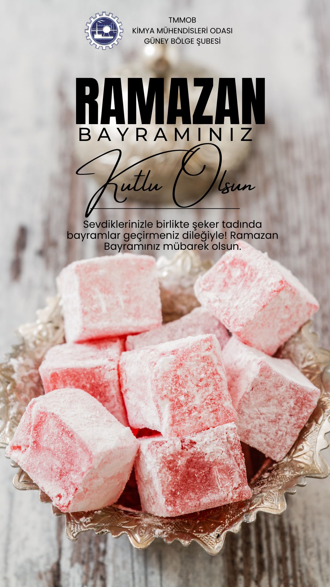 Ramazan Bayramı’nın; birlik, beraberlik ve dayanışmayı güçlendiren, sağlık, huzur ve mutluluk getiren bir bayram olmasını diliyoruz. Tüm meslektaşlarımızın ve milletimizin bayramını en içten dileklerimizle kutlarız. TMMOB KİMYA MÜHENDİSLERİ ODASI GÜNEY BÖLGE ŞUBESİ YÖNETİM KURULU