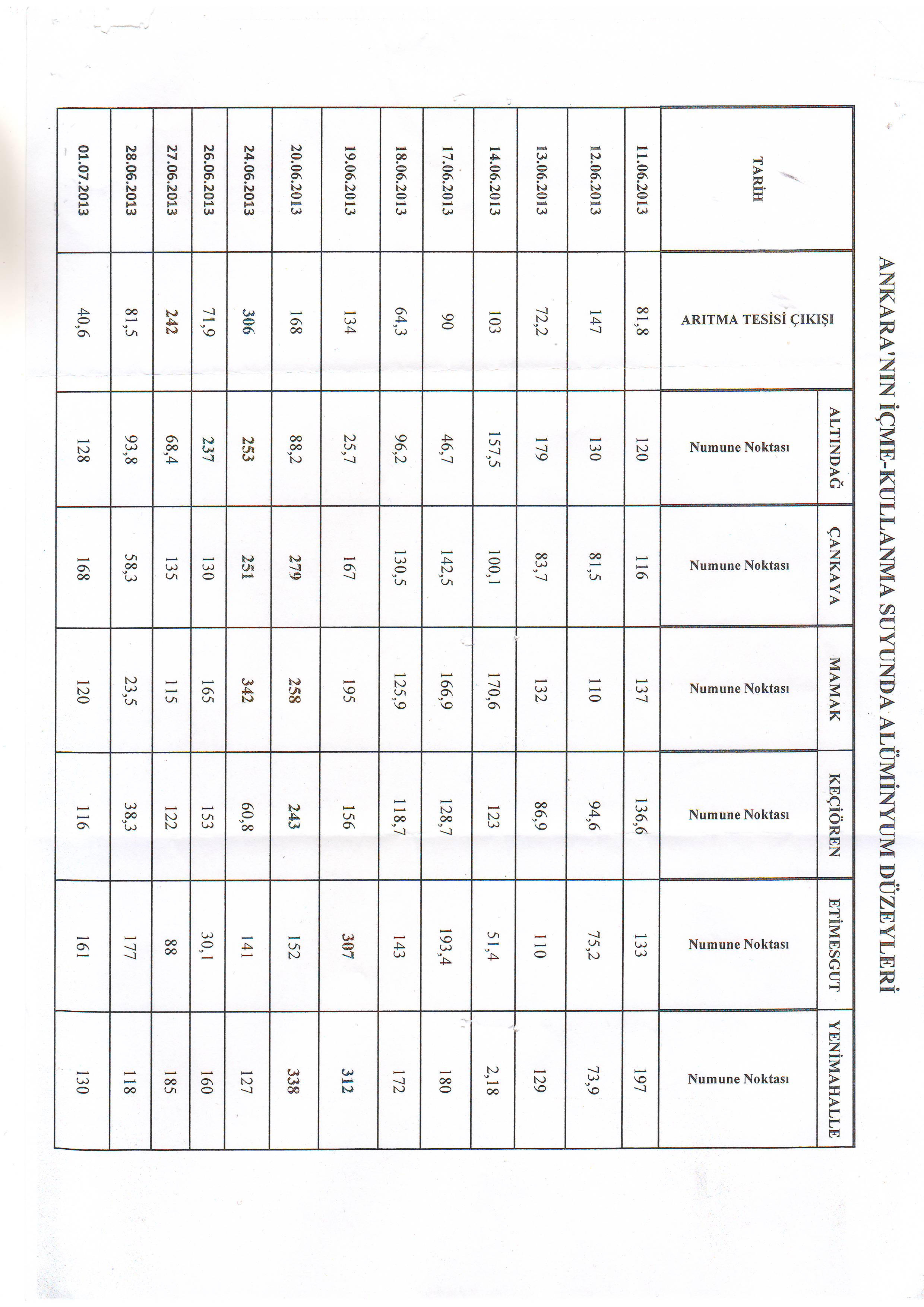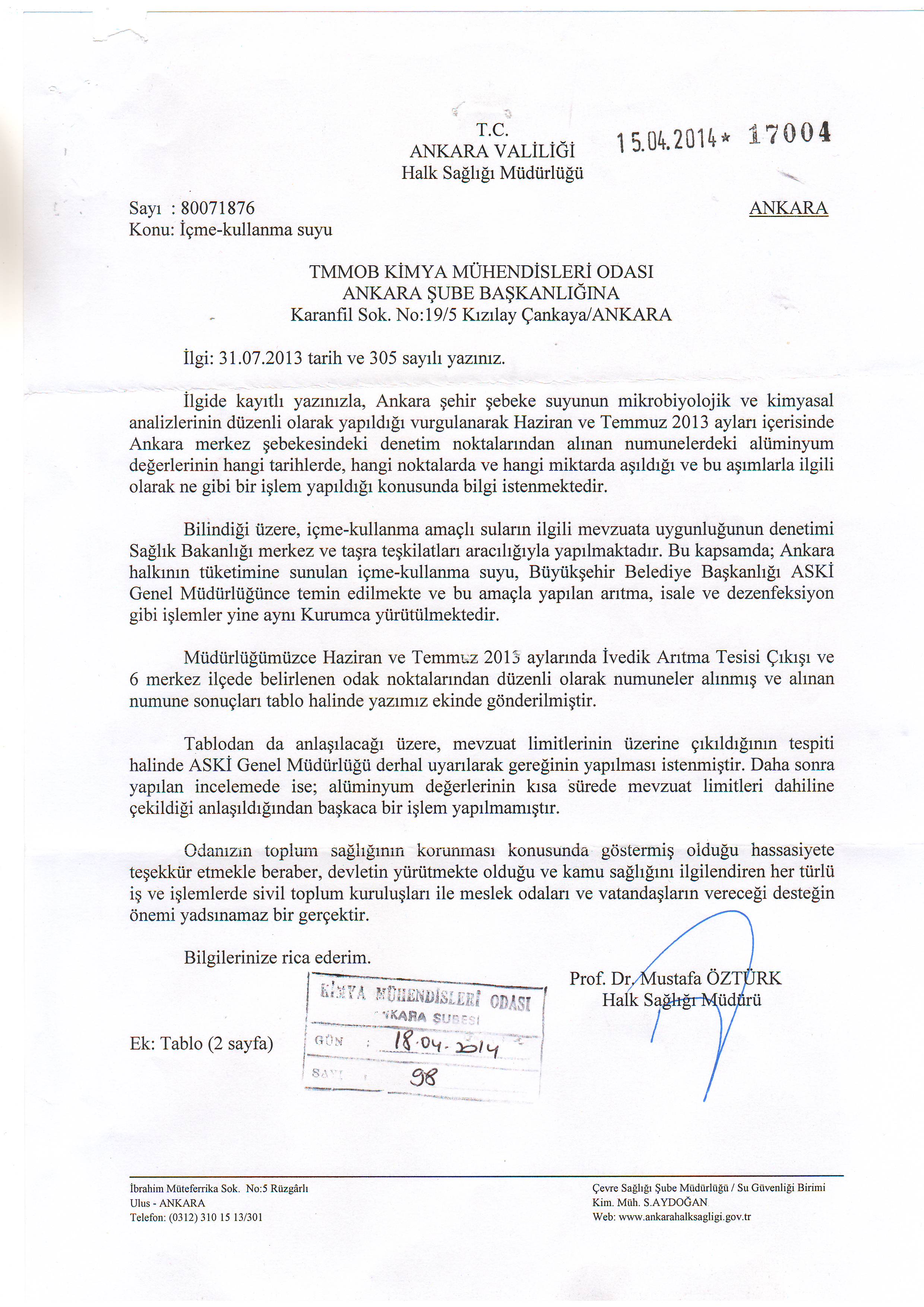 Odamızın 2013 yılı yaz aylarında gündeme getirdiği Ankara Şebeke suyundaki Alüminyum kirliliği, Sağlık Bakanlığınca kabul edildi. Ankara Büyükşehir Belediye Başkanı İ. Melih GÖKÇEK o günlerde su kirliliğini inkar ederek Odamızı dava edeceğini söylemişti.