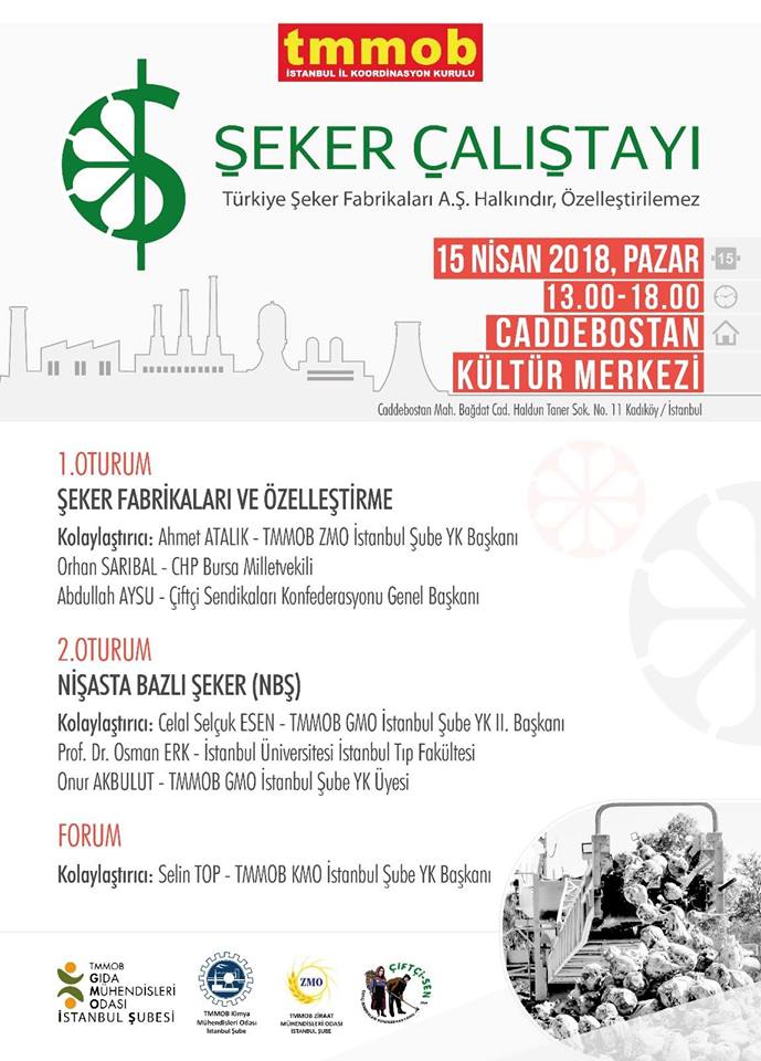Bu kapsamda TMMOB İstanbul İl Koordinasyonu Sekreterliğinde Gıda Mühendisleri Odası İstanbul Şubesi, Kimya Mühendisleri Odası İstanbul Şubesi, Ziraat Mühendisleri Odası İstanbul Şubesi ve Çifçi-SEN 15 Nisan‘da Şeker Çalıştayı düzenleyecektir.