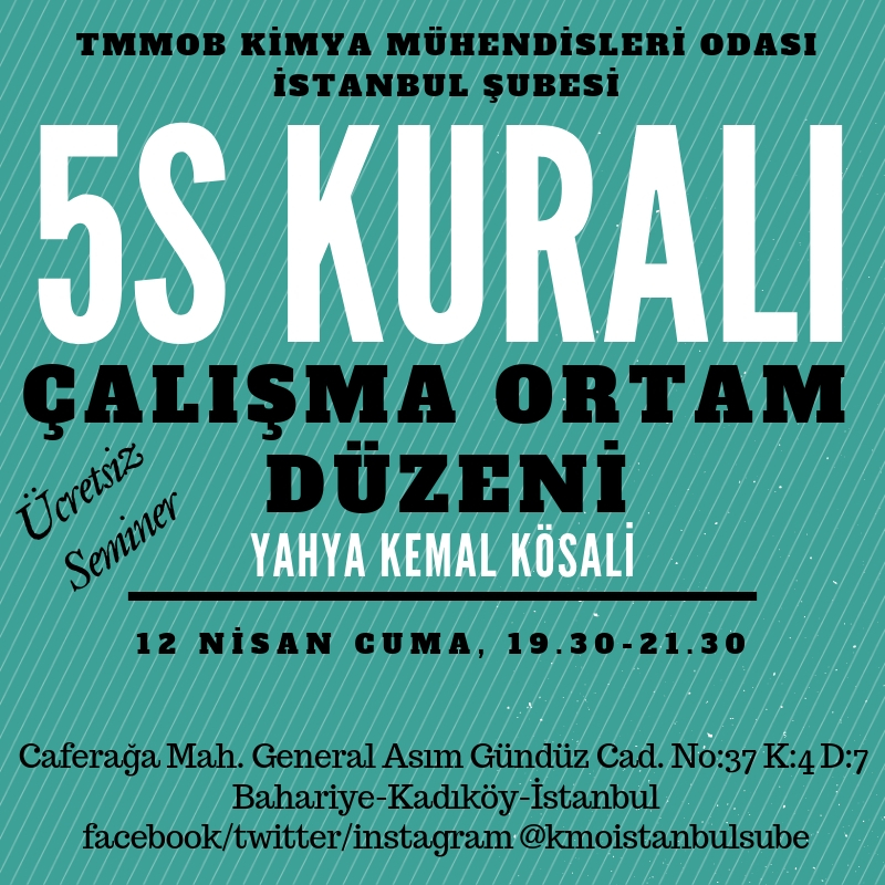 12 Nisan 2019 Cuma akşamı şubemizde üyelerimize yönelik "5S Kuralı: Çalışma Ortam Düzeni" konulu seminer gerçekleşecektir.