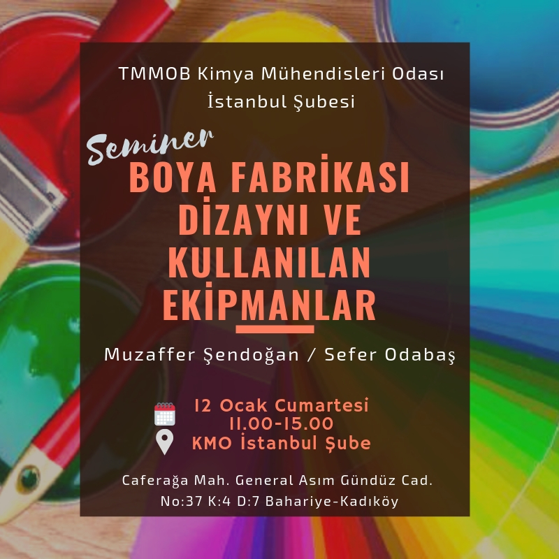 12 Ocak 2019 Cumartesi günü şubemizde `Boya Fabrikası Dizaynı ve Kullanılan Ekipmanlar` konulu seminer gerçekleşecektir.