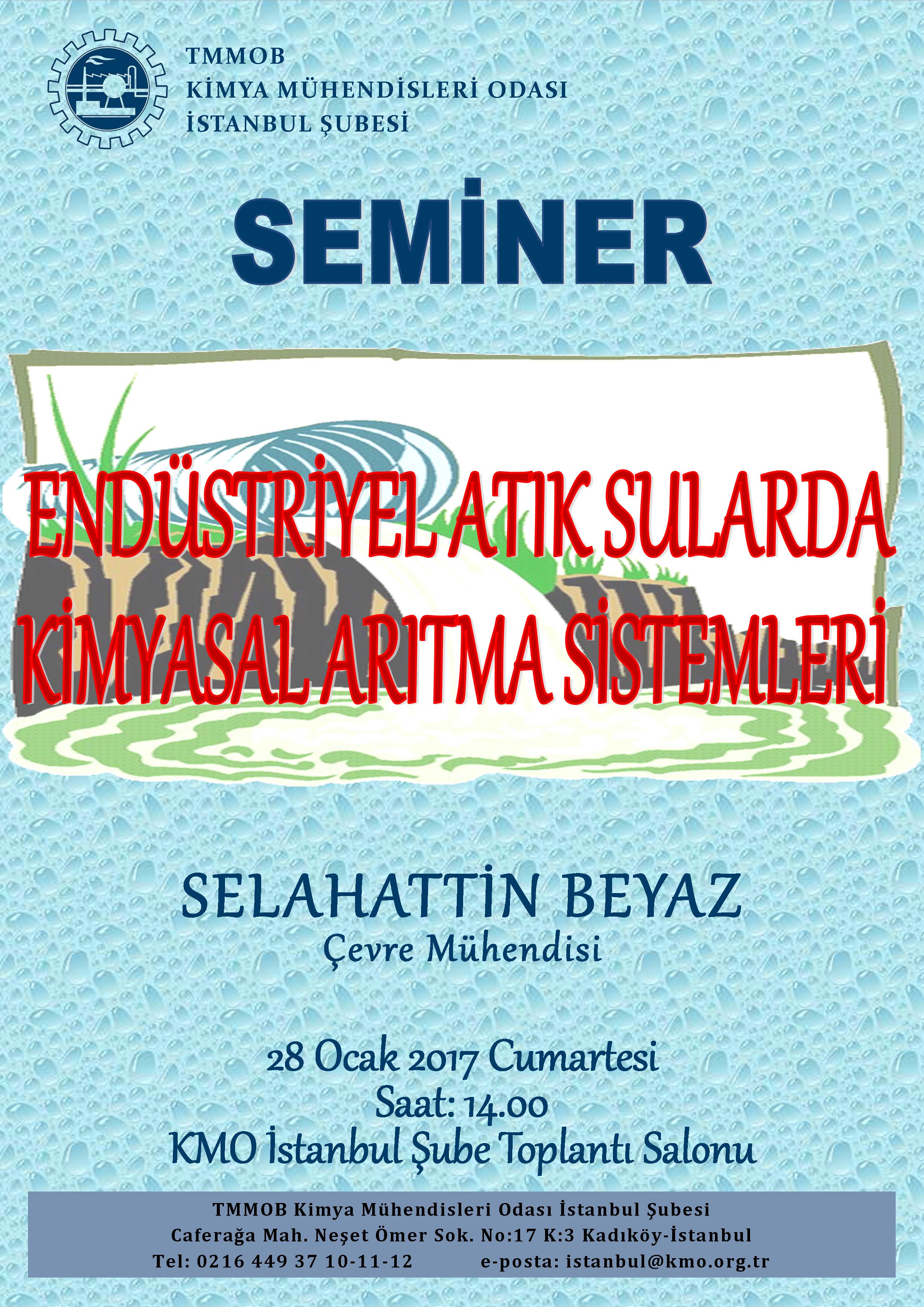 28 Ocak 2017 Cumartesi günü şubemizde ücretsiz olarak `Endüstriyel Atık Sularda Kimyasal Arıtma Sistemleri` konulu seminer düzenlenecektir