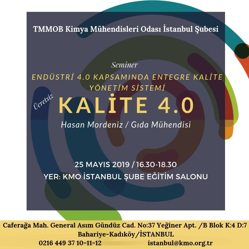 25 Mayıs 2019 Cumartesi günü, 16:30-18:30 saatleri arasında şubemizde `Kalite 4.0 (Endüstri 4.0 Kapsamında Entegre Kalite Yönetim Sistemi)` konulu seminer gerçekleşecektir.