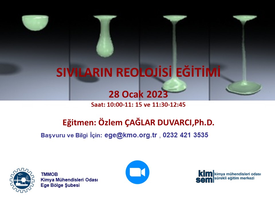28 Ocak 2023 tarihinde 10.00-12.45 saatleri arasında düzenleyeceğimiz "Sıvıların Reolojisi Eğitimi" miz Zoom programı üzerinden online olarak gerçekleşecektir. Eğitim ile ilgili detaylı bilgi aşağıda olup eğitime katılmak isteyenlerin, ekte gönderilen başvuru formunu doldurup istenen belgeler ile birlikte 25 Ocak 2023 tarihine kadar, ege@kmo.org.tr adresine göndermelerini rica ederiz.
