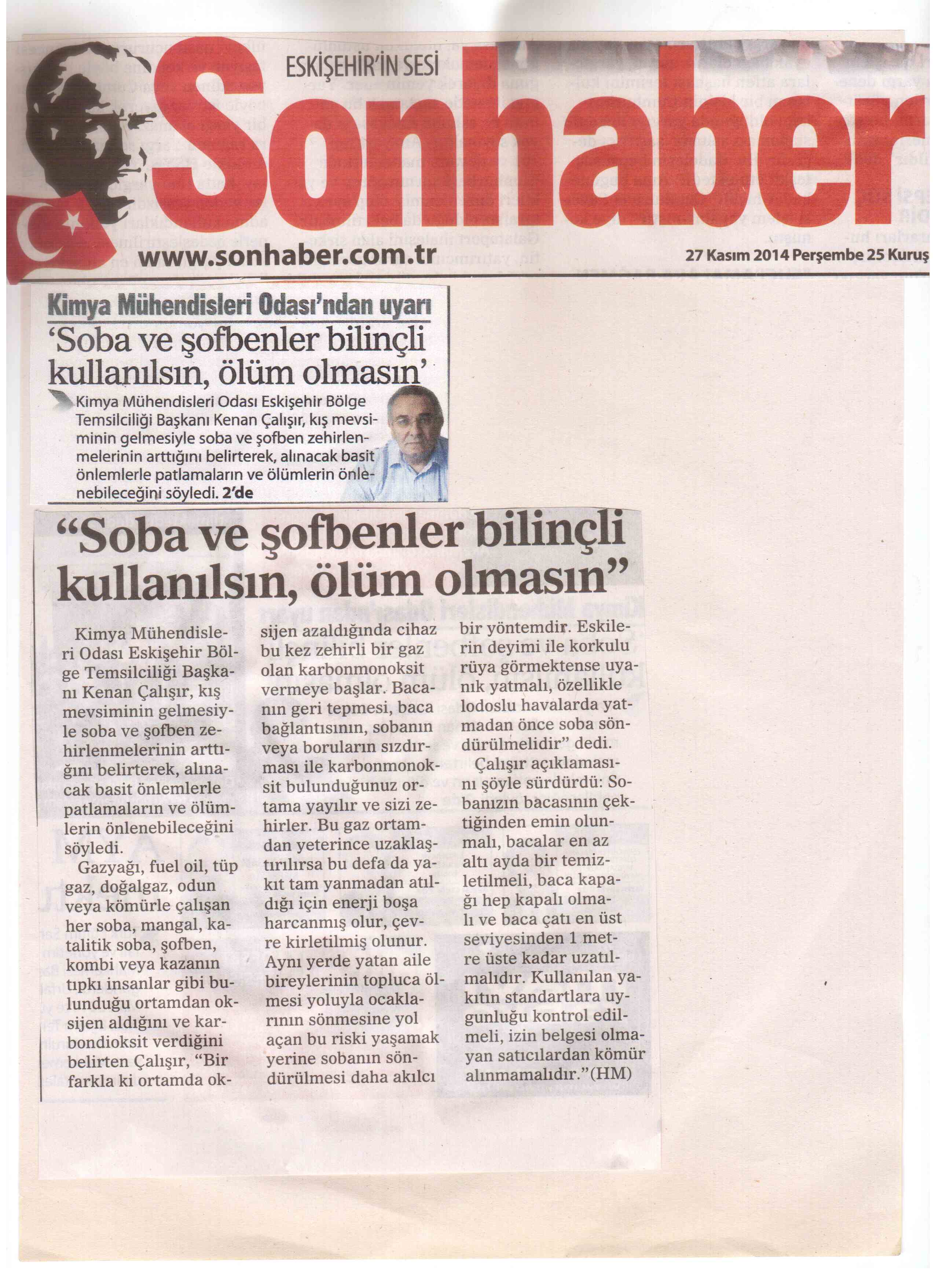 `SOBA VE ŞOFBENLER BİLİNÇLİ KULLANILSIN `ADLI AÇIKLAMAMIZ BASINDA YERİNİ ALDI