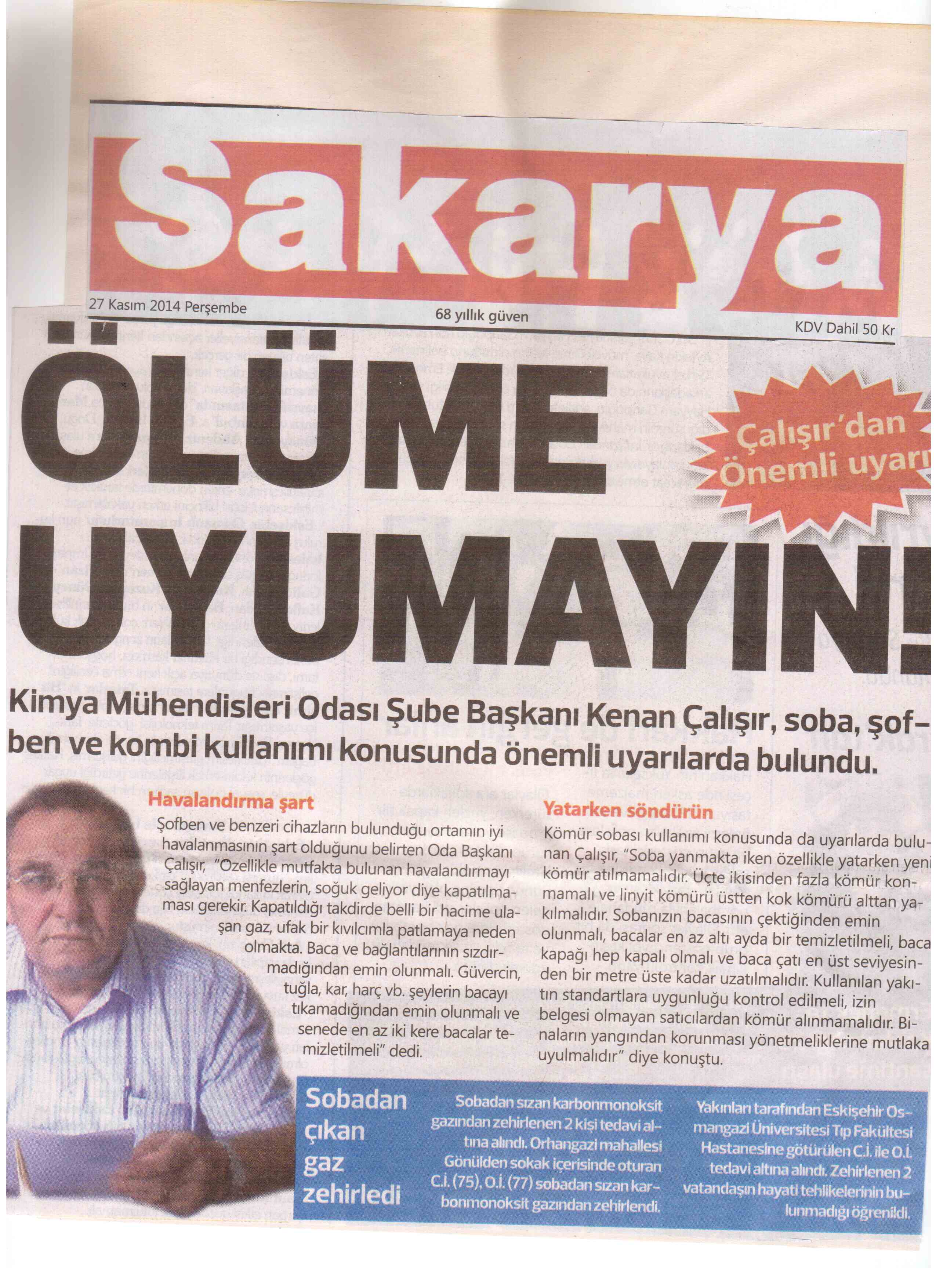 Bilindiği gibi sonbahar kış mevsimi geldiğinde soba ve şofben zehirlenmeleri vakaları artmakta ve hemen her gün basında ölüm haberleri yer almaktadır. Kimya Mühendisleri Odası olarak insanlarımızın hayatını kaybetmesine yol açan bu vahim olaylarla ilgili olarak aşağıdaki açıklamayı yapmayı görev sayıyoruz.