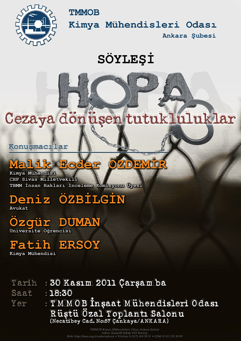 "HOPA; Cezaya Dönüşen Tutukluluklar" konulu söyleşi 30 Kasım 2011 Çarşamba günü saat 18:30da CHP Sivas Milletvekili, TBMM İnsan Hakları İnceleme Komisyonu Üyesi Sn. Malik Ecder ÖZDEMİR, Av. Deniz ÖZBİLGİN, Üniversite Öğrencisi Özgür DUMAN, meslektaşımız Fatih ERSOYların katılımları ile TMMOB İnşaat Mühendisleri Odası Rüştü ÖZAL Toplantı Salonunda gerçekleştirilmiştir.